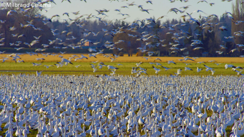 Snow geese, Anser caerulescens migrate to Washington State from the harsh winters in Russia. After feeding in Washington farmlands, some stay for the winter and then fly back home. Others continue their migration to feed further south and winter in Central California, before heading home.